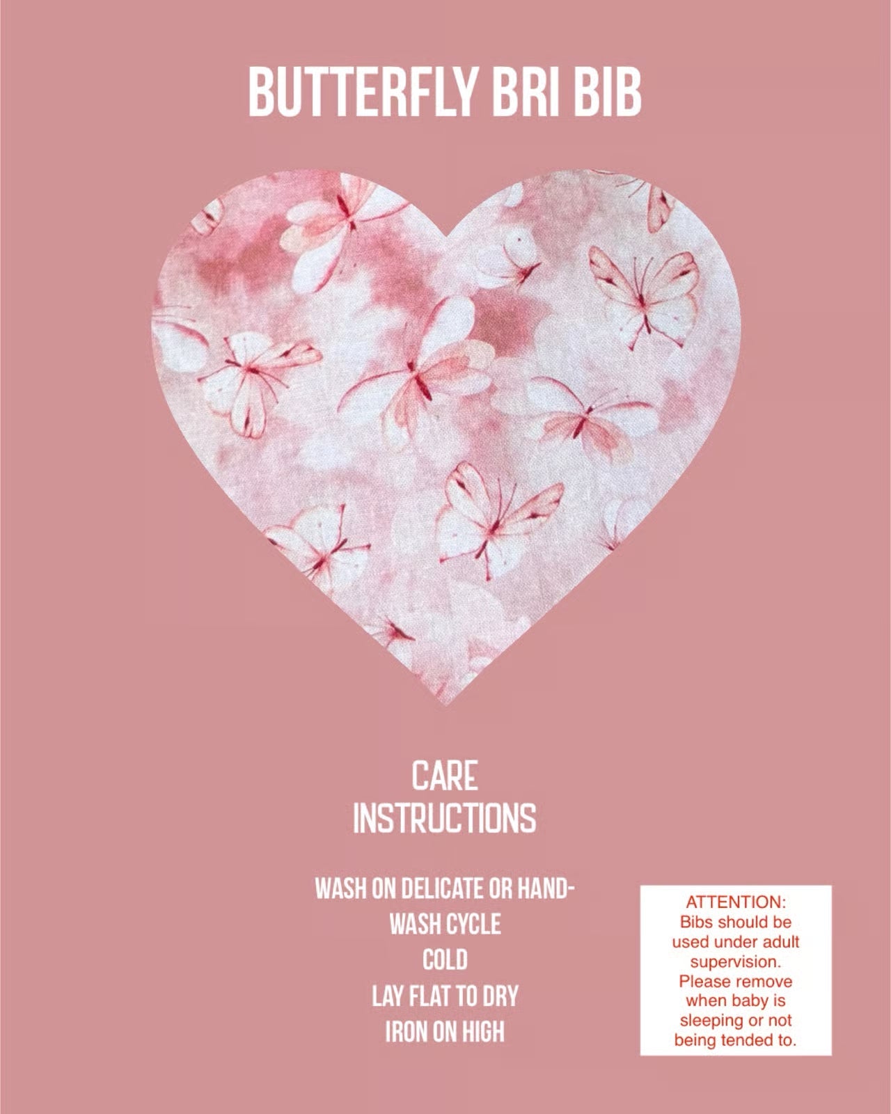 Super absorbent handmade bib with pink butterfly design fabric. Snap button closure. Care instructions: Hand wash or gentle cycle Lay flat or tumble dry low Iron on high