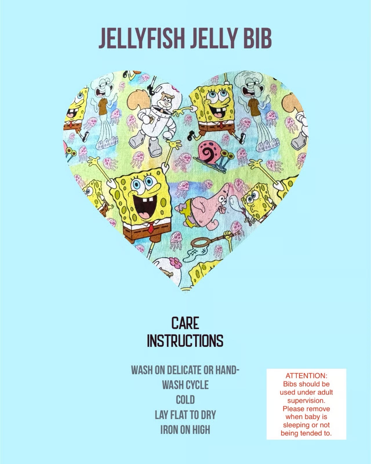 Super absorbent handmade bib with Spongebob Squarepants, Patrick Starr and Sandy Cheeks jellyfishing fabric design. Colors include aqua blue, yellow, white, black, pink, and green. Snap button closure.