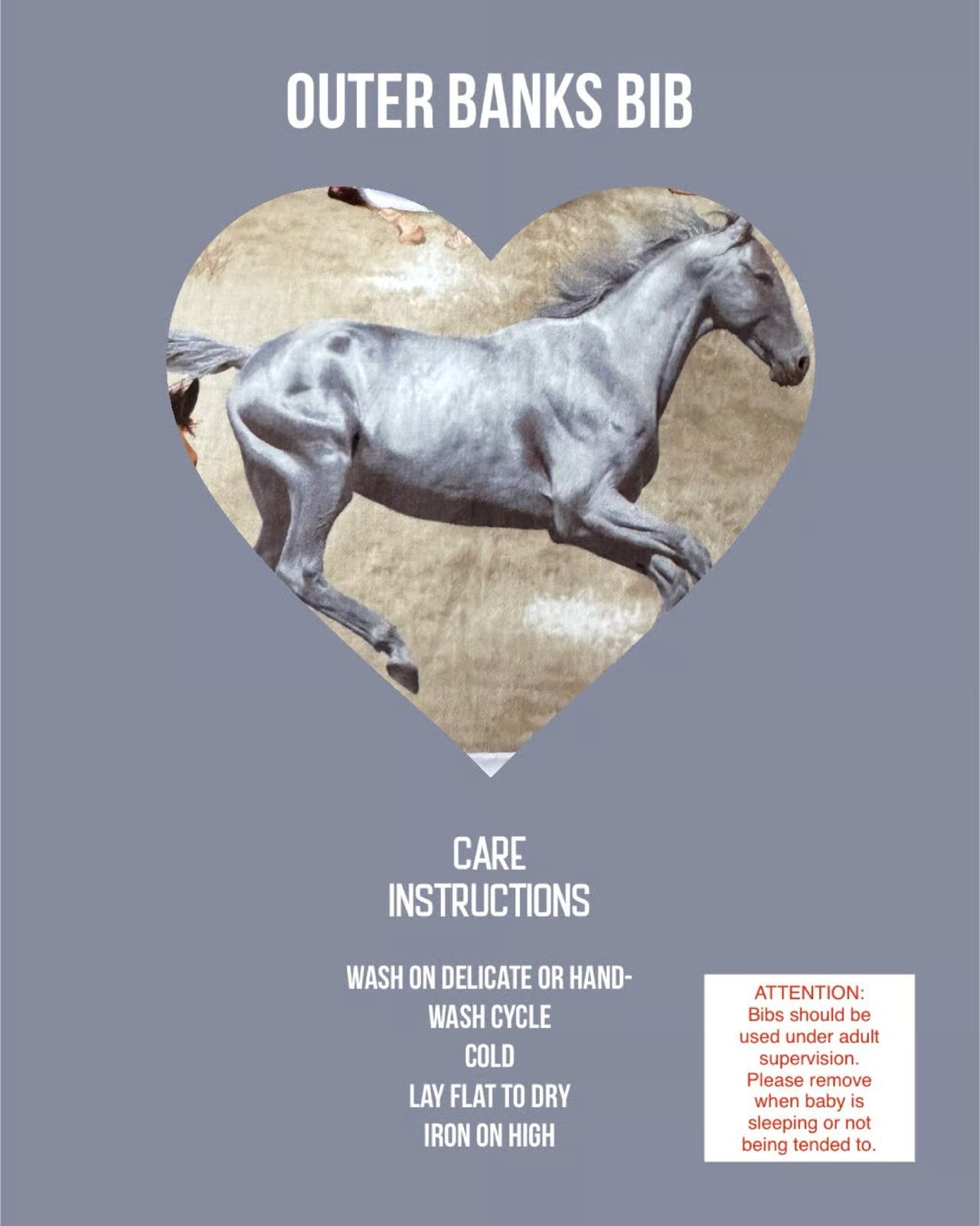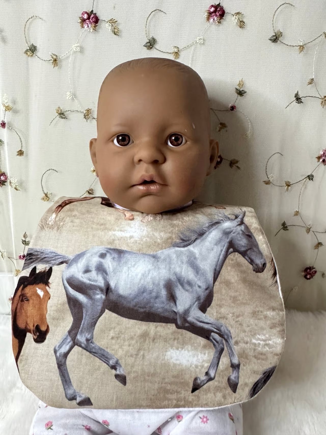 Super absorbent handmade bib with a white horse running design. Snap button closure.